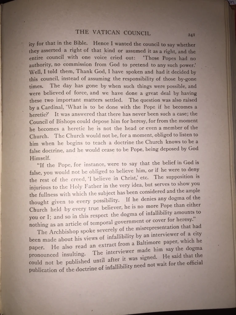 Nažalost, za [one*] koji vjeruju kako papa može biti krivovjerac te i dalje ostati poglavar Katoličke crkve, to se pitanje doista pojavilo na Prvom vatikanskom saboru, koji je 1870. definirao dogmu o papinskoj nezabludivosti. Na konferenciji održanoj po njegovu povratku sa Sabora, nadbiskup John Baptist Purcell iz Cincinnatija, rekao je sljedeće […*]: